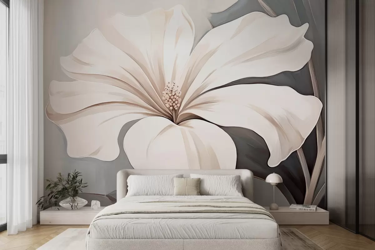 Wall murals Large white flower with petals on a blue-gray background Nr. w09033