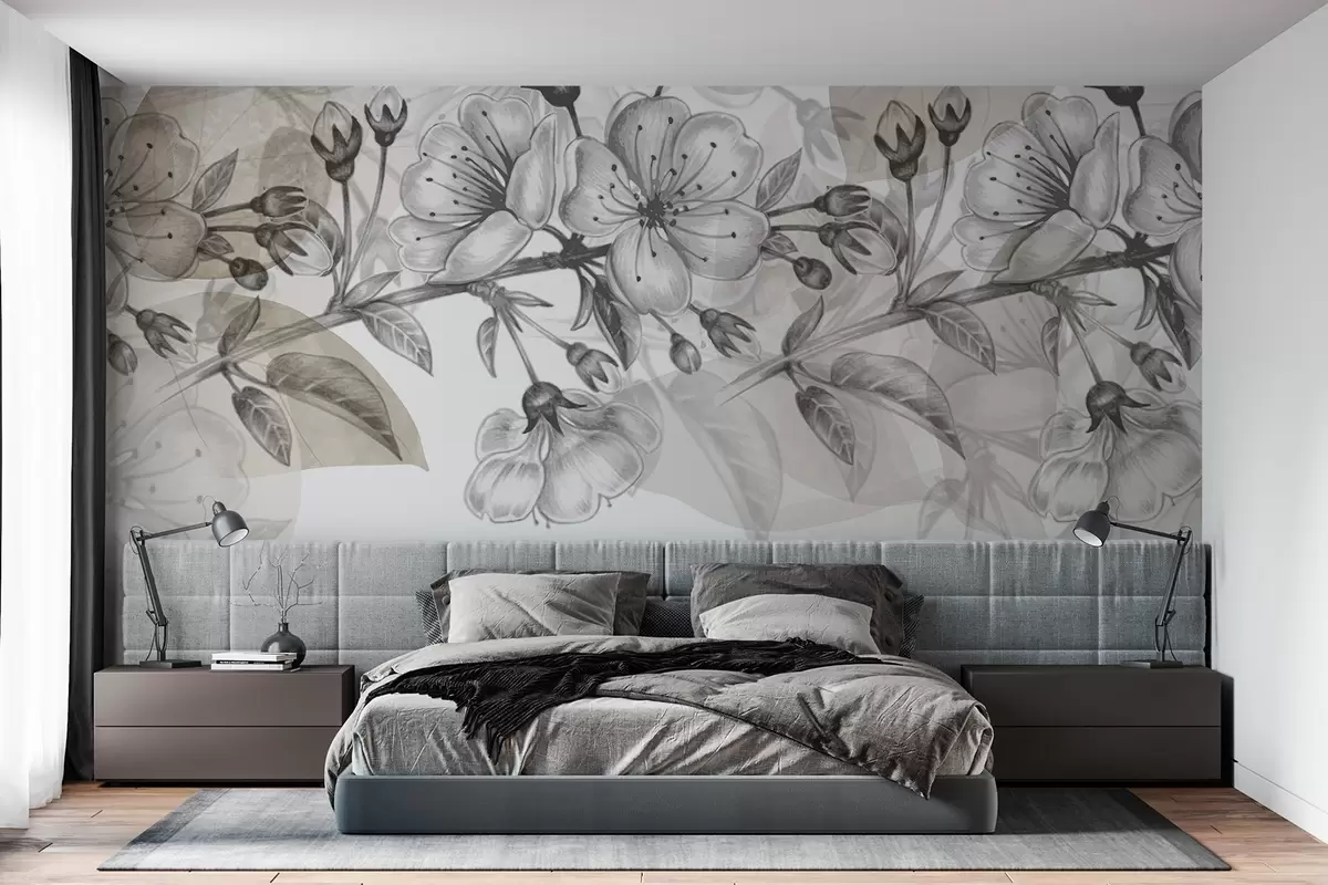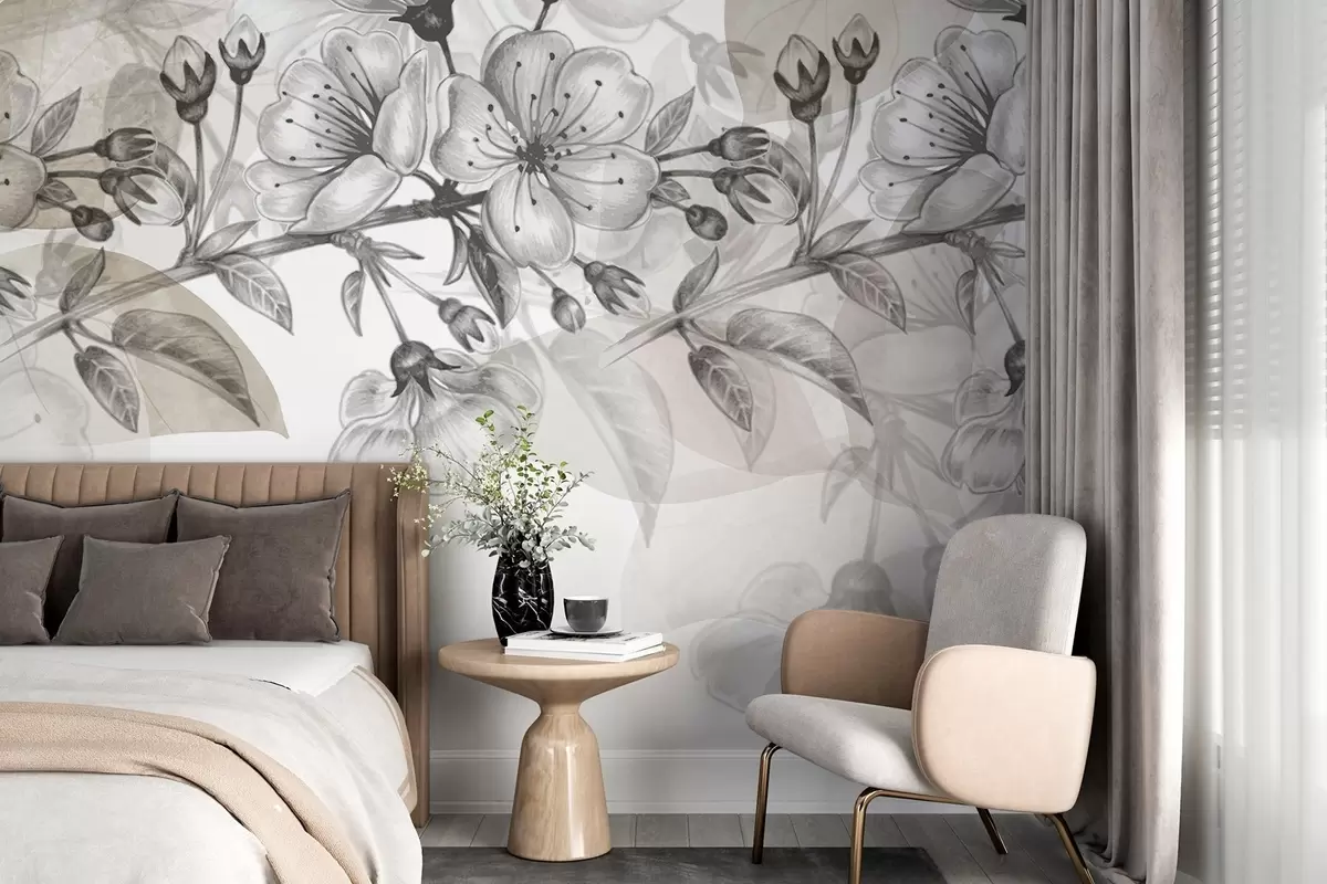 Wall murals Cherry blossom branch with flowers and buds, sepia tones, soft watercolor-like background with gray and brown hues Nr. w09051v1