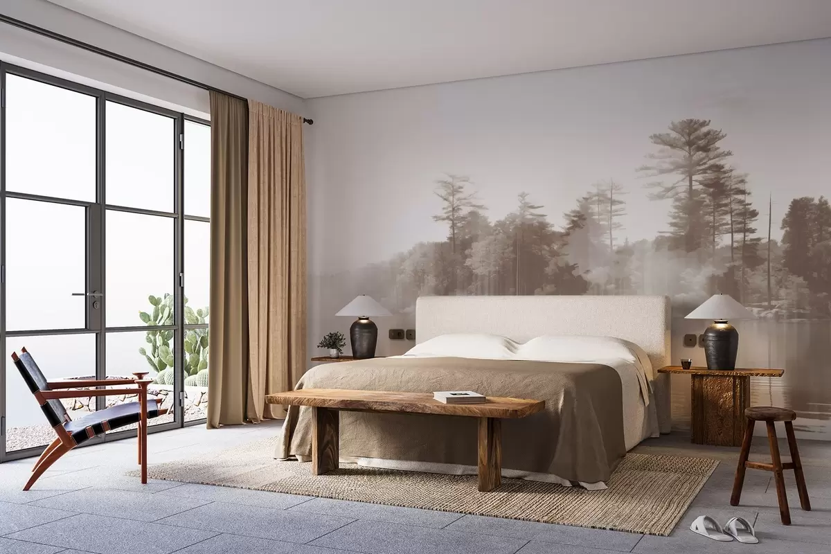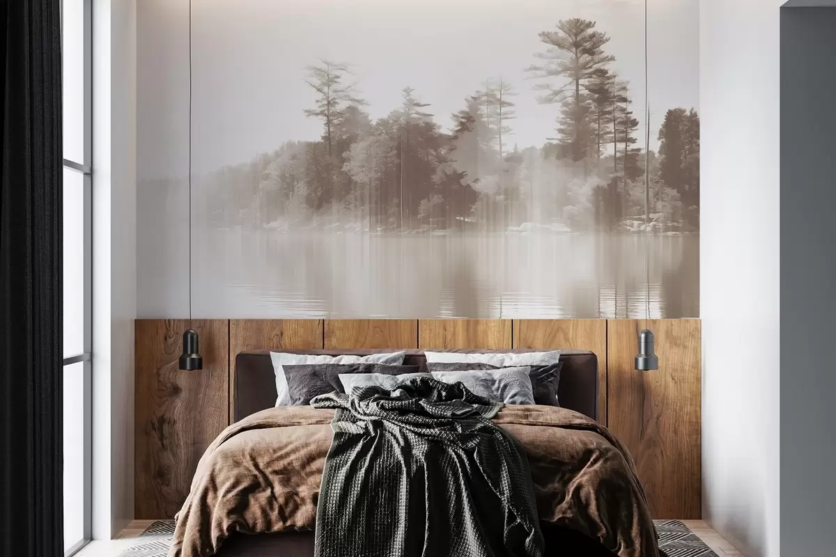 Wall murals Abstract minimalism textured landscape with a lake and trees reflections in the water in beige and white shades Nr. w09058v1