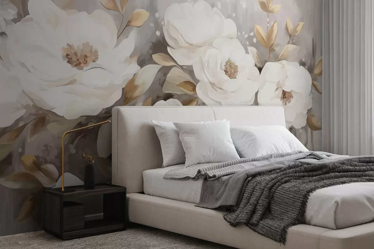 Wall murals White flowers with yellow leaves, soft petals, delicate floral arrangement, neutral color palette, textured brushstrokes Nr. w09062