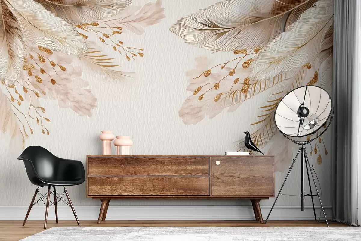 Wall murals Pampas grass and feathers in watercolor style in beige and white on paper Nr. w09079