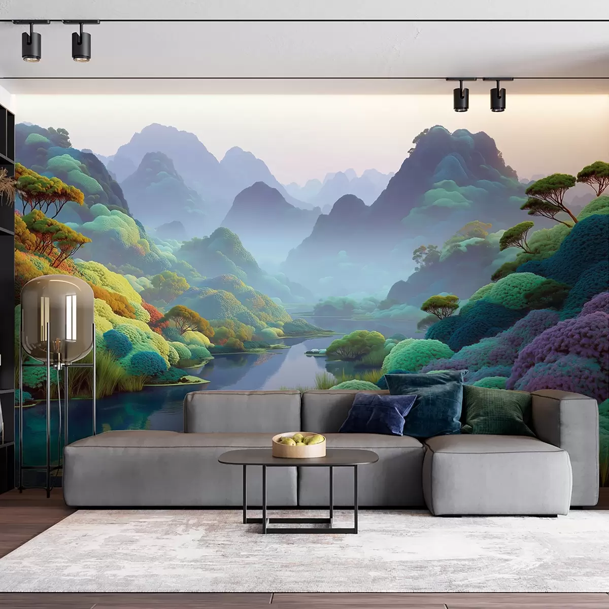 Wall murals Mountain landscape with a river in blue tones with trees and bushes Nr. w09088