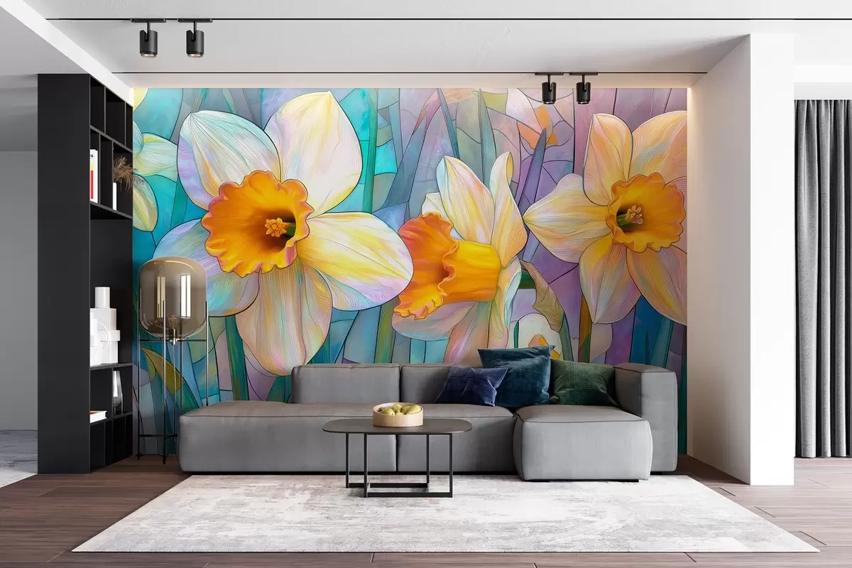 Wall murals Colorful daffodils on a blue-violet stained glass background Nr. w09092
