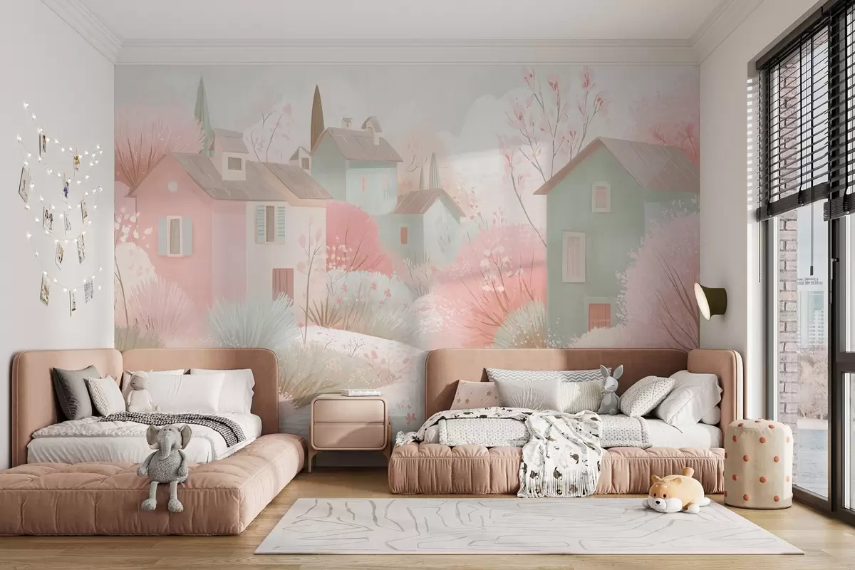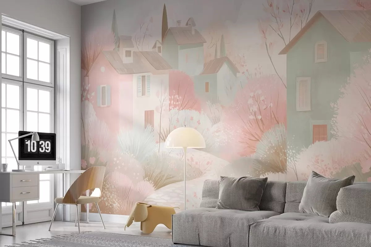Wall murals Fairy-tale town in oil painting style in pink shades Nr. w09095