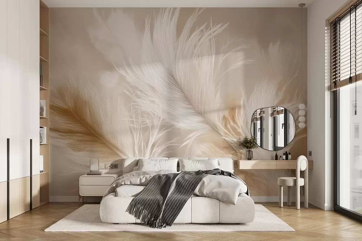 Wall murals Flying airy feathers on a beige background Nr. w09102
