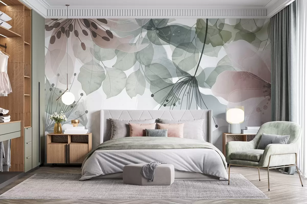 Wall murals Flowers and leaves in pastel colors, translucent petals and leaves, soft watercolor effect, delicate lines, white background Nr. w09107