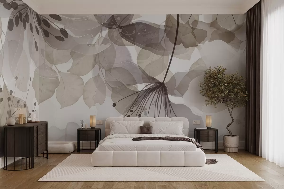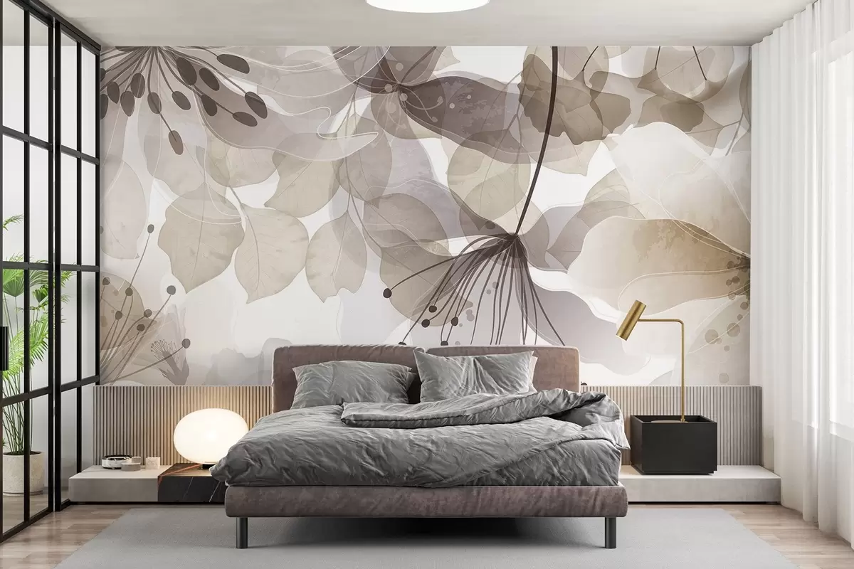 Wall murals Flowers and leaves in beige colors, translucent petals and leaves, soft watercolor effect, delicate lines, white background Nr. w09107v1