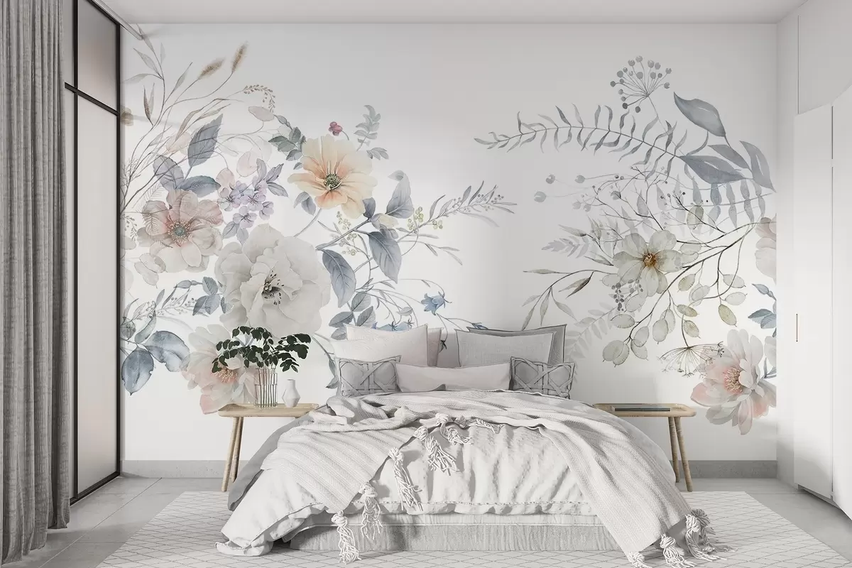Wall murals Floral arrangement in watercolor painting style with white, peach and blue flowers, delicate greenery on a white background Nr. w09108