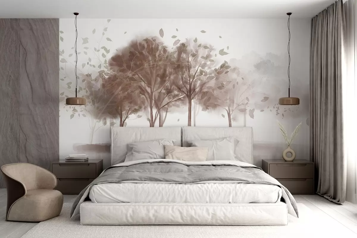 Wall murals Abstract landscape with trees with brown leaves reflecting in the water, in watercolor textured style Nr. w09109v1