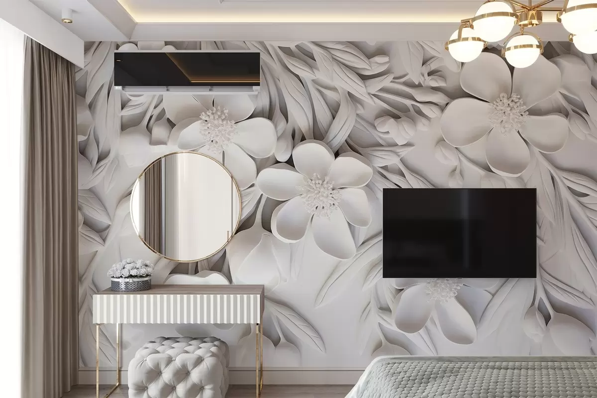 Wall murals White flowers and leaves in a white background, floral elegant, decorative design, intricate details Nr. w09113