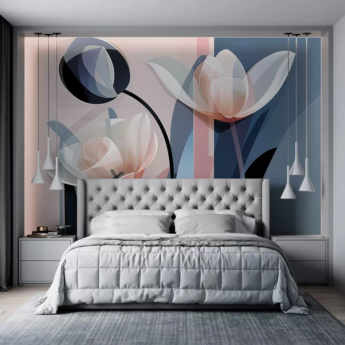 Wall murals Abstract modern design with tulips with transparent petals in pastel shades of pink, white, and dark blue Nr. w09116