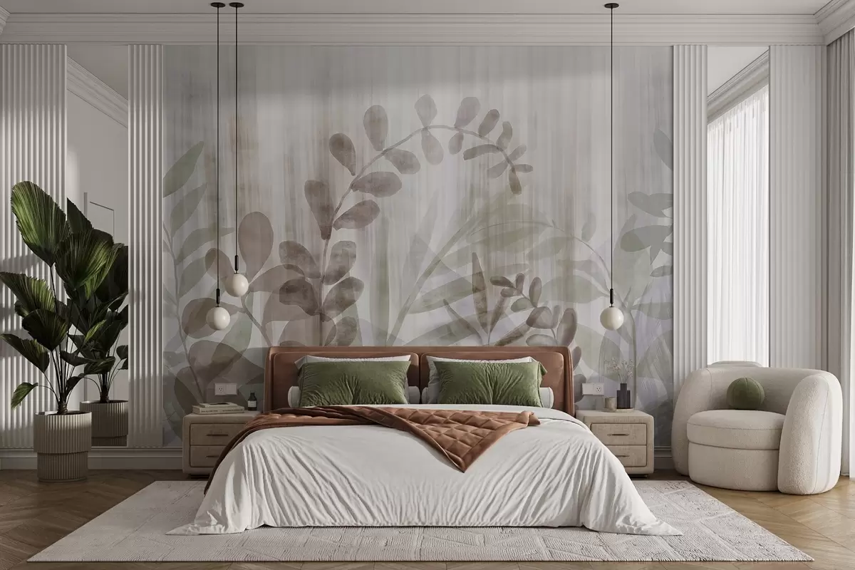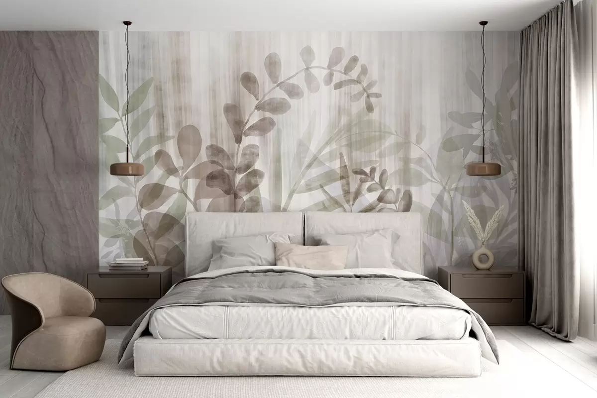 Wall murals Watercolor painting imitation of plants with multicolor muted leaves, light background with vertical lines, botanical illustration Nr. w09146v1