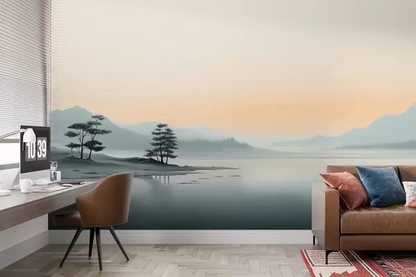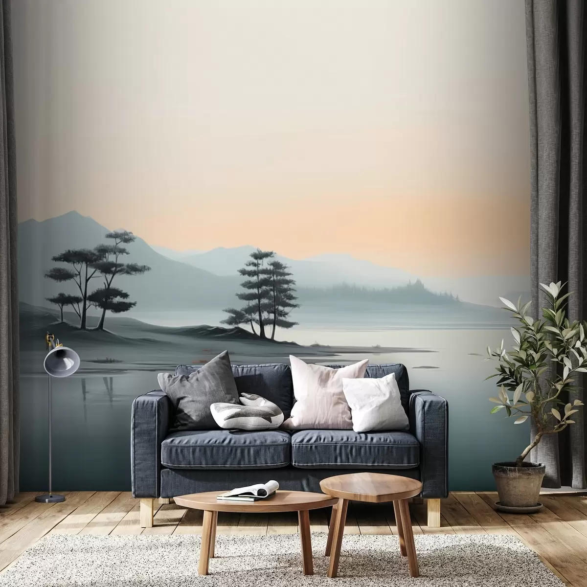 Wall murals Minimalist landscape with misty mountains and a lake Nr. w09151