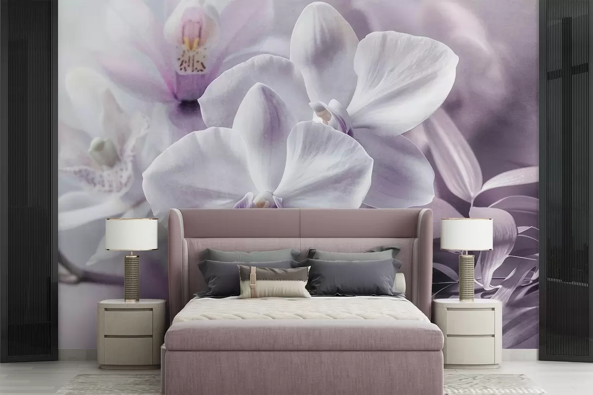 Wall murals White and lilac delicate orchid flowers, soft lighting, and a blurred textured background Nr. w09155