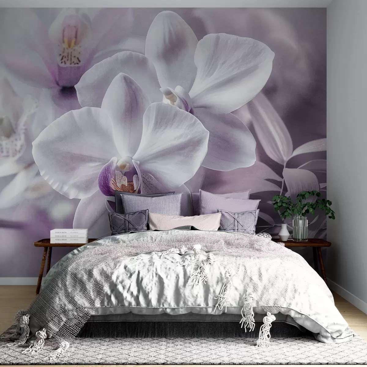 wall murals White and lilac delicate orchid flowers, soft lighting, and a blurred textured background w09155
