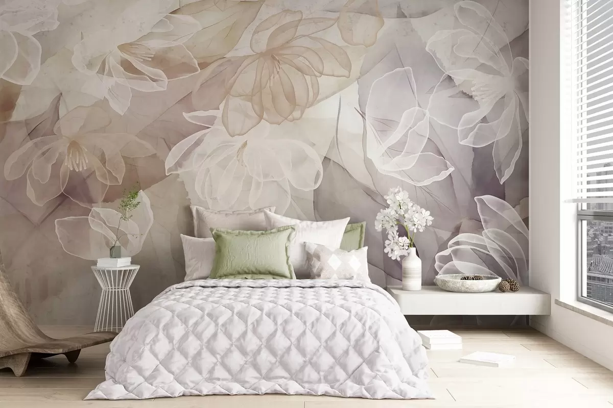 Wall murals Flowers and leaves with transparent petals in shades of white, beige and purple, soft and delicate Nr. w09158