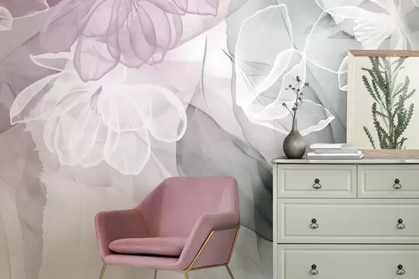 Wall murals Flowers and leaves with transparent petals in shades of white, pink and green, soft and delicate Nr. w09158v1