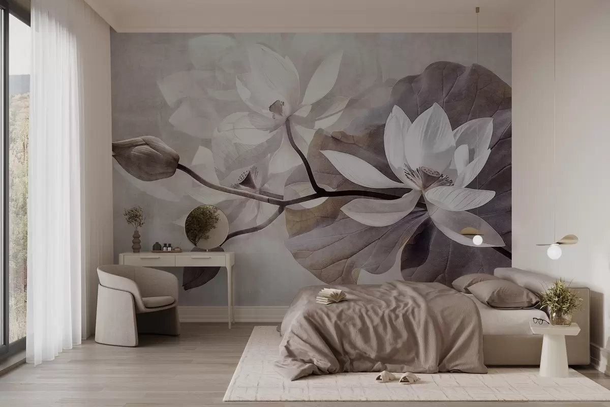 Wall murals Grainy textured muted delicate lotus flowers with leaves and stems in a soft, beige color palette Nr. w09159