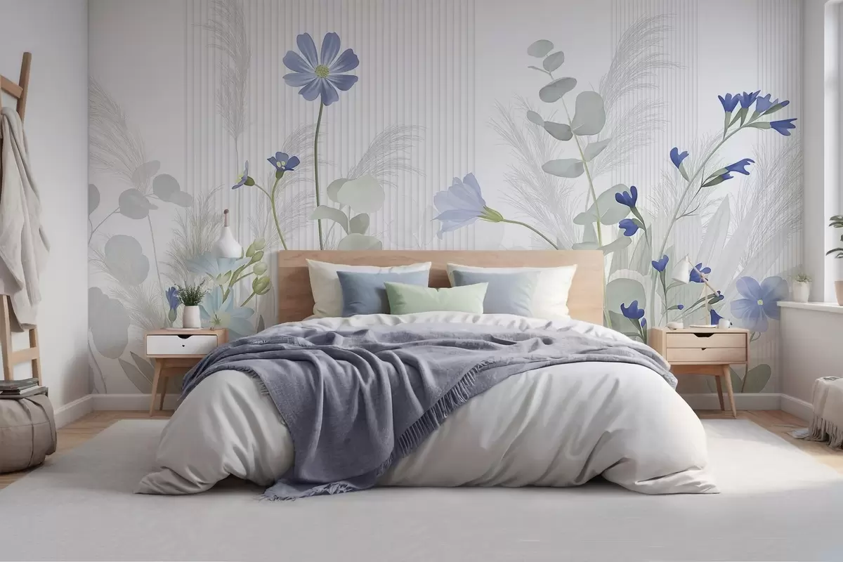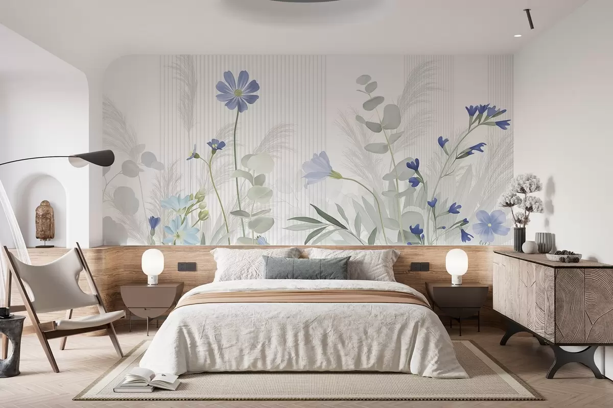 Wall murals Flowers in pastel colors, light green leaves, white background with vertical lines, elegant and minimalist Nr. w09161v1
