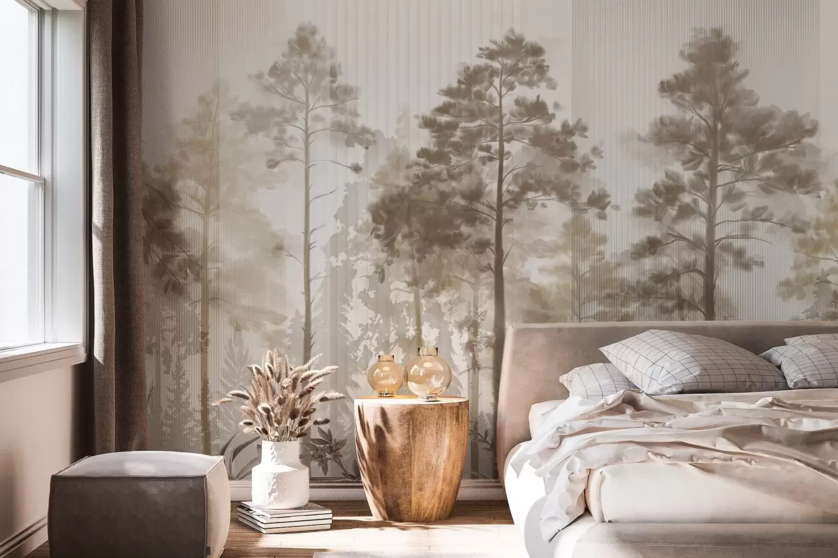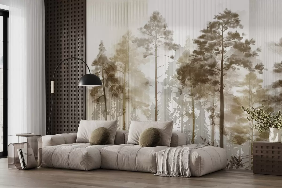 Wall murals A dense forest with tall pine trees, lush beige foliage, a misty atmosphere with vertical lines textures Nr. w09163v1