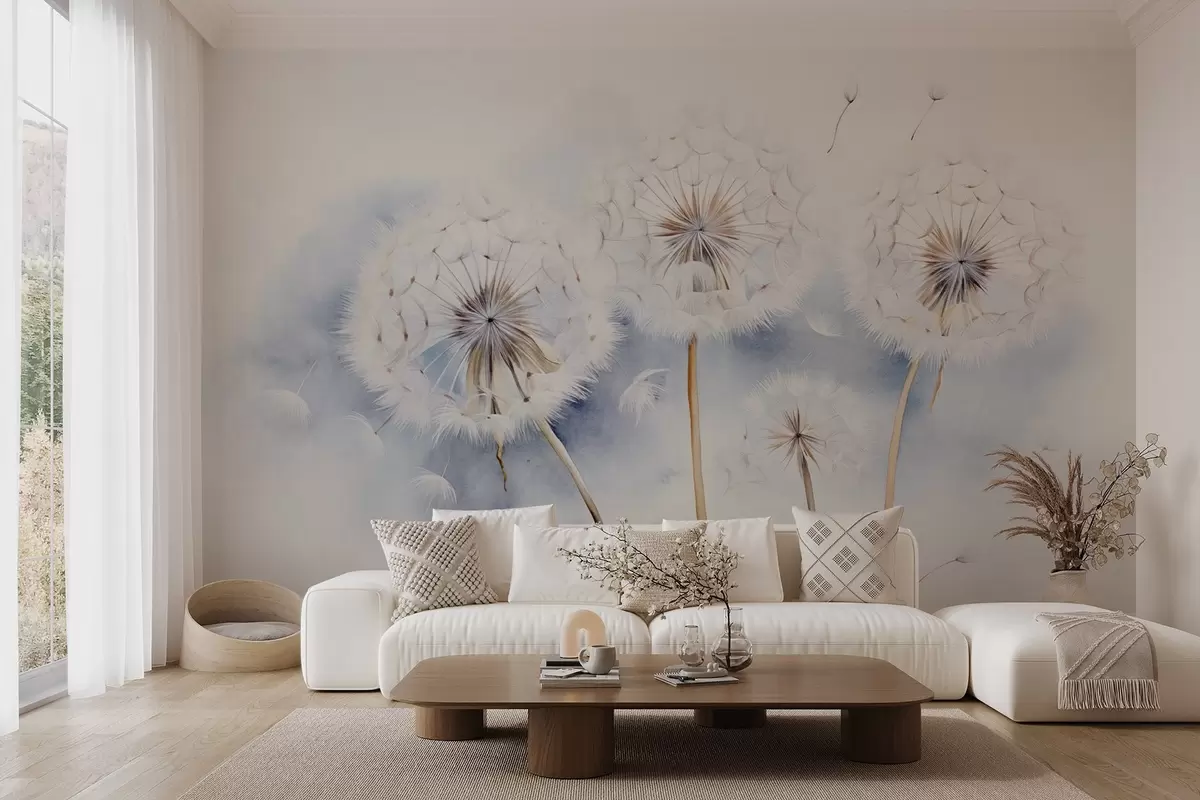 Wall murals Textured dandelions with seeds floating in the air, light blue and white background, soft delicate drawing style Nr. w09190