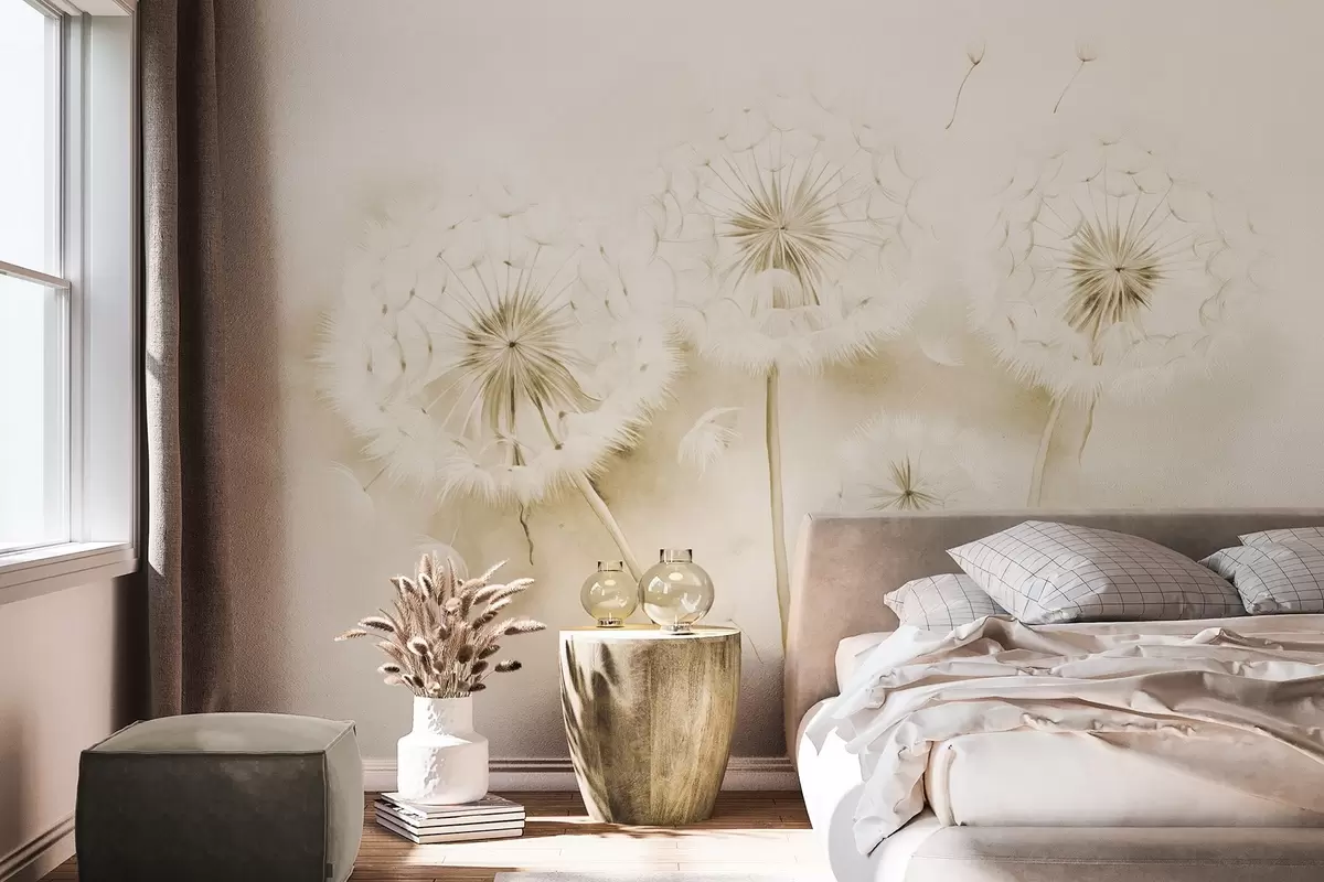 Wall murals Textured dandelions with seeds floating in the air, muted yellow and white background, soft delicate drawing style Nr. w09190v1