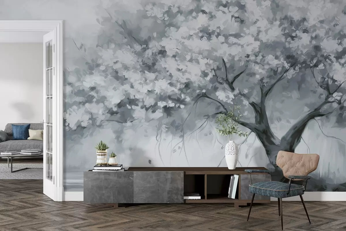Wall murals Abstract muted blue blossom tree in full bloom, next to a river, soft textured brushstrokes and pastel colors Nr. w09193v2