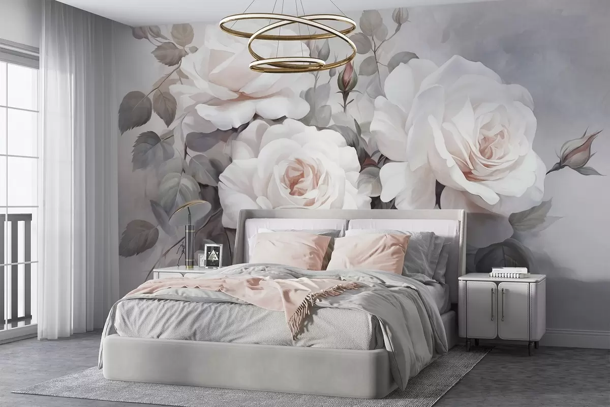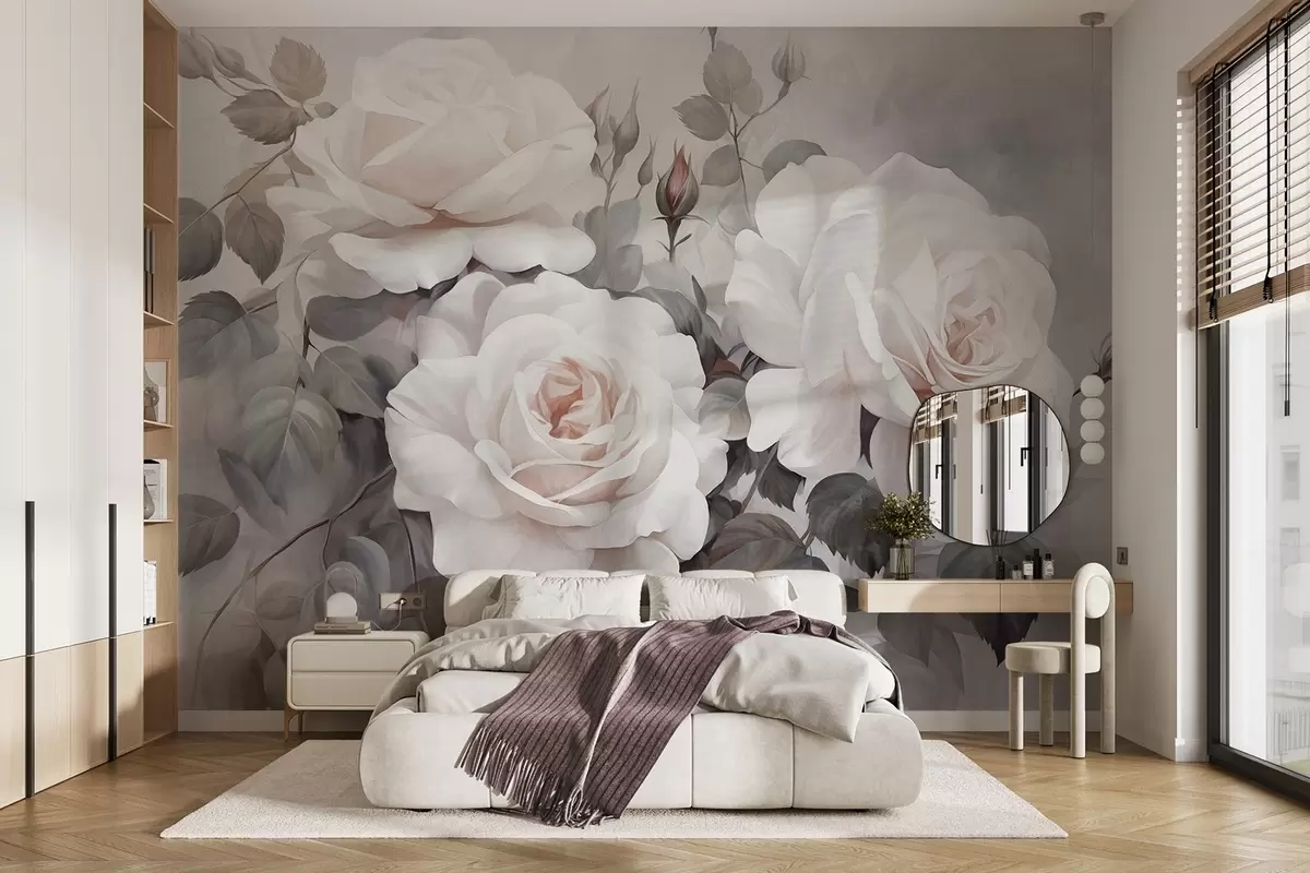 Wall murals Textured white roses with leaves and stems, soft muted pastel colors, elegant vintage style , delicate brushstrokes Nr. w09198