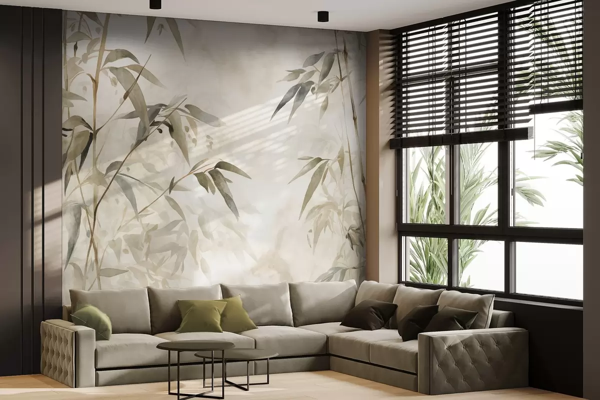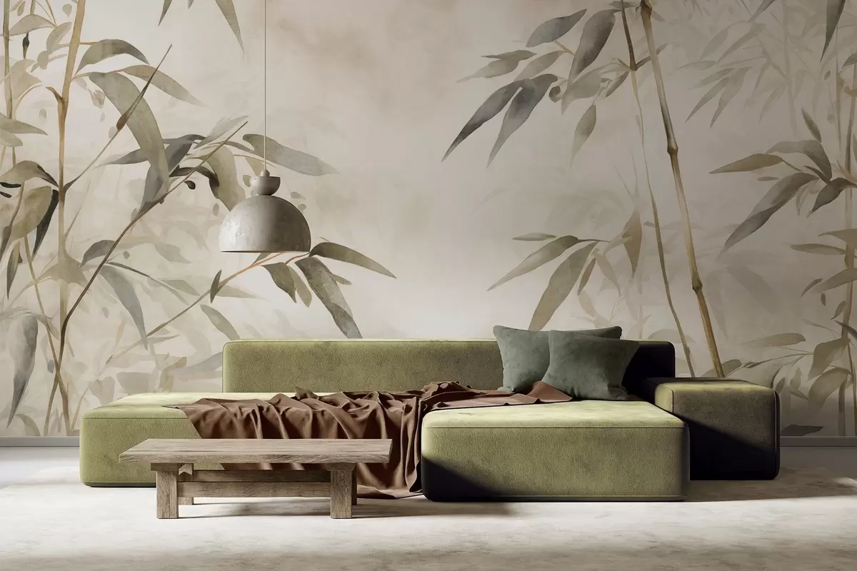 Wall murals Bamboo textured branches with leaves in a watercolor style, soft neutral color palette, light beige background Nr. w09204