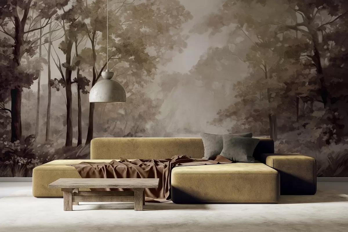 Wall murals Textured forest landscape, trees with beige and brown leaves, pastel color palette Nr. w09210