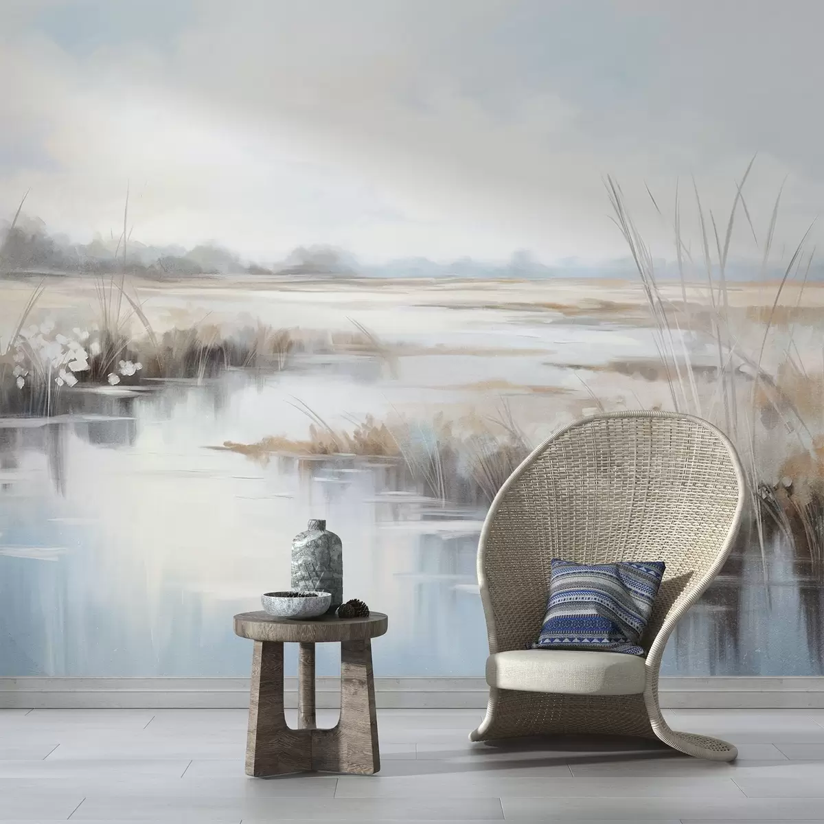Wall murals Textured tranquil landscape with tall grasses and calm water, soft pastel colors, distant trees on the horizon Nr. w09213