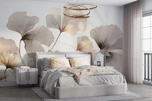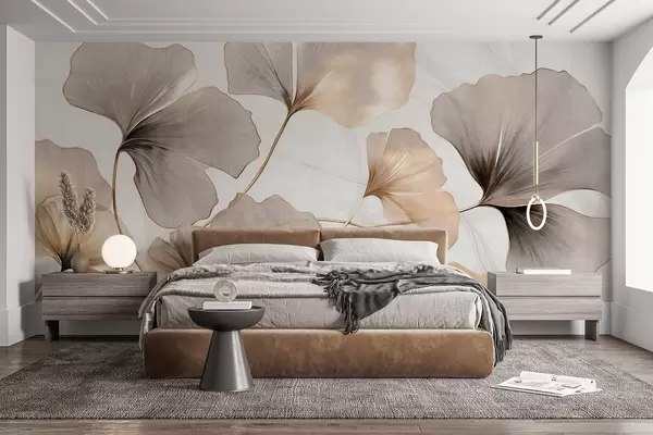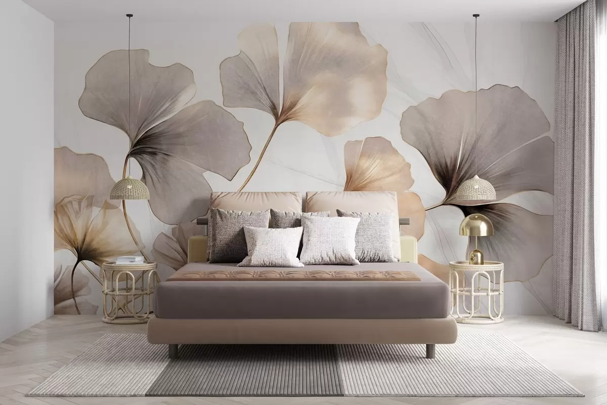 Wall murals Ginkgo biloba leaves in beige, yellow and brown tones, delicate textured watercolor effect, light background Nr. w09215