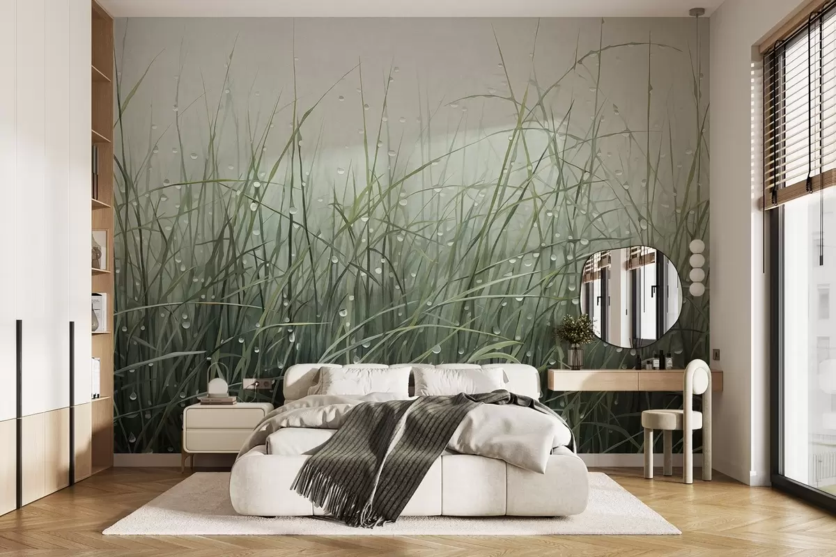 Wall murals Grass with water drops, muted green shades, soft light, misty background, abstract minimalist textured style Nr. w09217