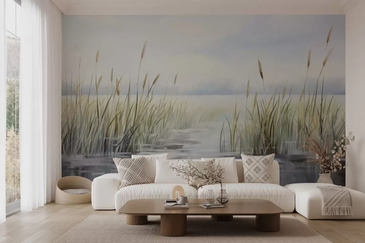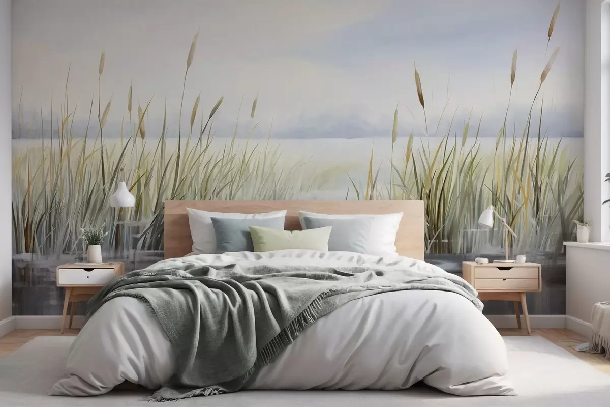 Wall murals A watercolor textured painting imitation of landscape with lake, grass, overcast sky and blurred background Nr. w09219