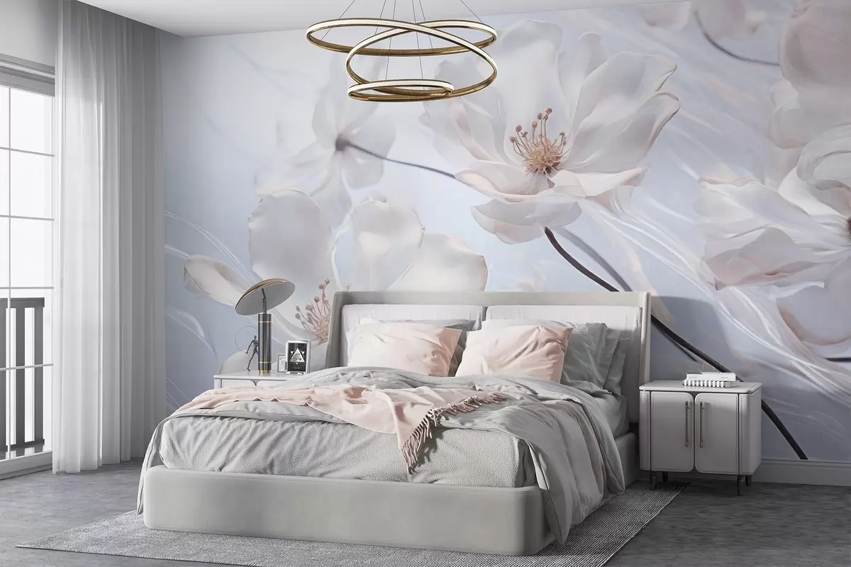 Wall murals White textured transparent flowers with delicate petals, soft light blue background, elegant, romantic, dreamy Nr. w09233