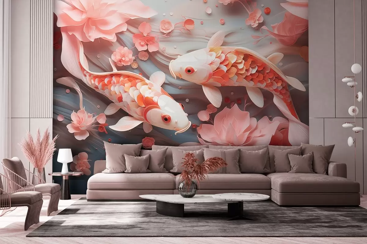 Wall murals Delicate fish with dimensional scales swim through a flow of petals and soft pink tones Nr. w09237