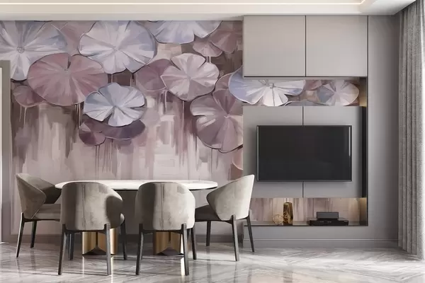 Wall murals Textured lily pads with violet and blue colors in a pond, the background is a blurry mix of soft shades of purple Nr. w09255v1