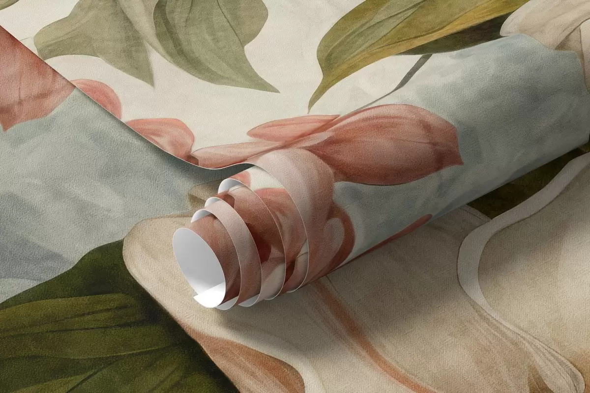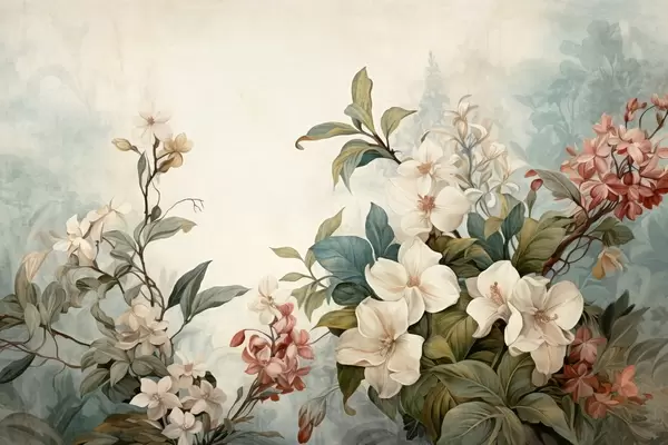 Wall murals Textured tropical flowers and leaves with soft blue and green hues, delicate brushstrokes, vintage botanical style Nr. w09259