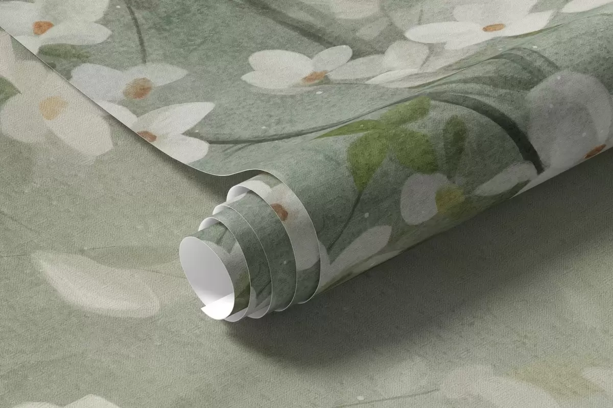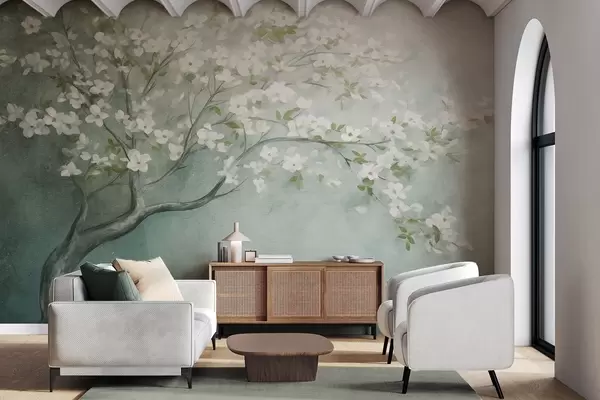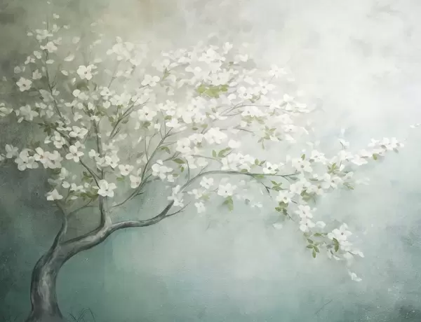wall murals A blooming tree with white flowers in full bloom, against a grainy noisy textured background of muted blue and green w09261