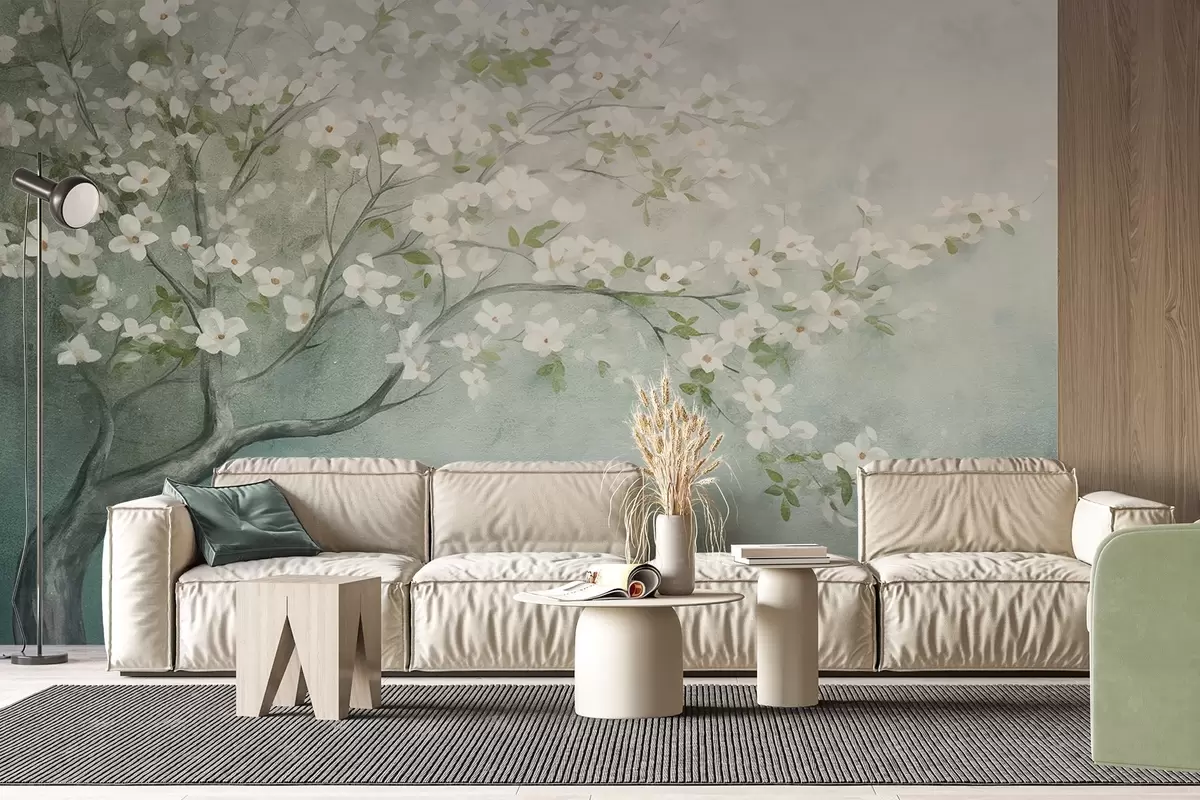 Wall murals A blooming tree with white flowers in full bloom, against a grainy noisy textured background of muted blue and green Nr. w09261