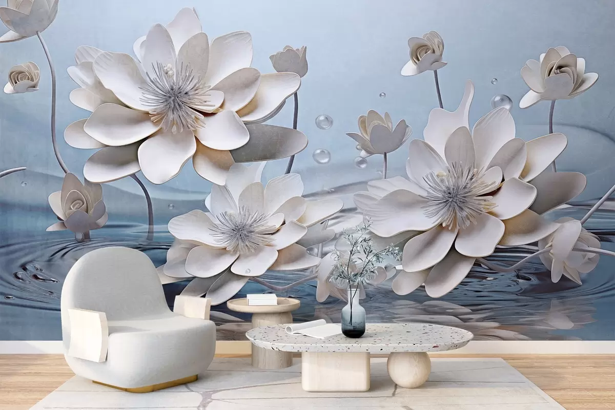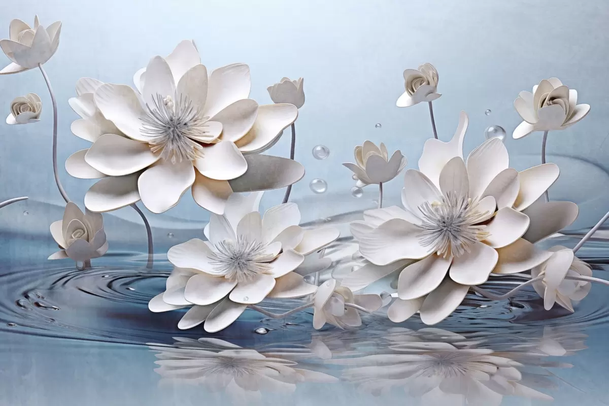 Wall murals White textured flowers with water drops, reflections on the water surface, light blue background, elegant design Nr. w09262