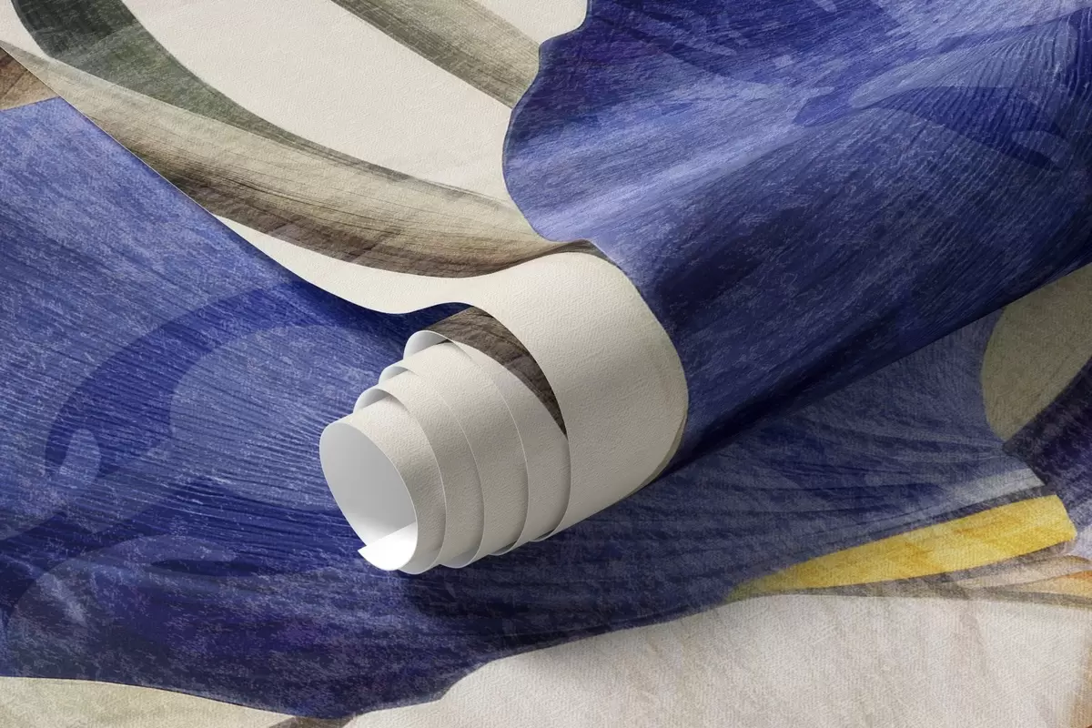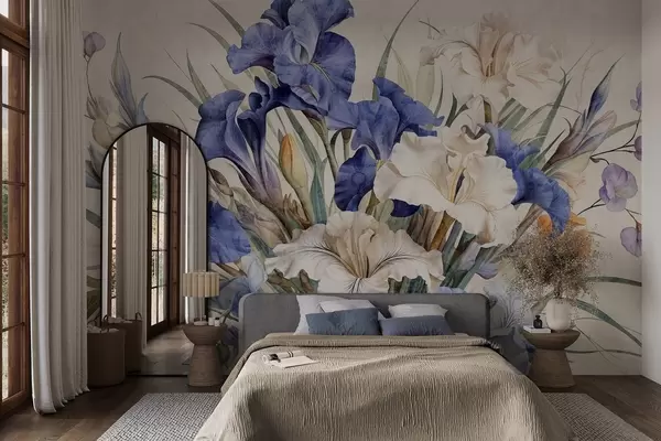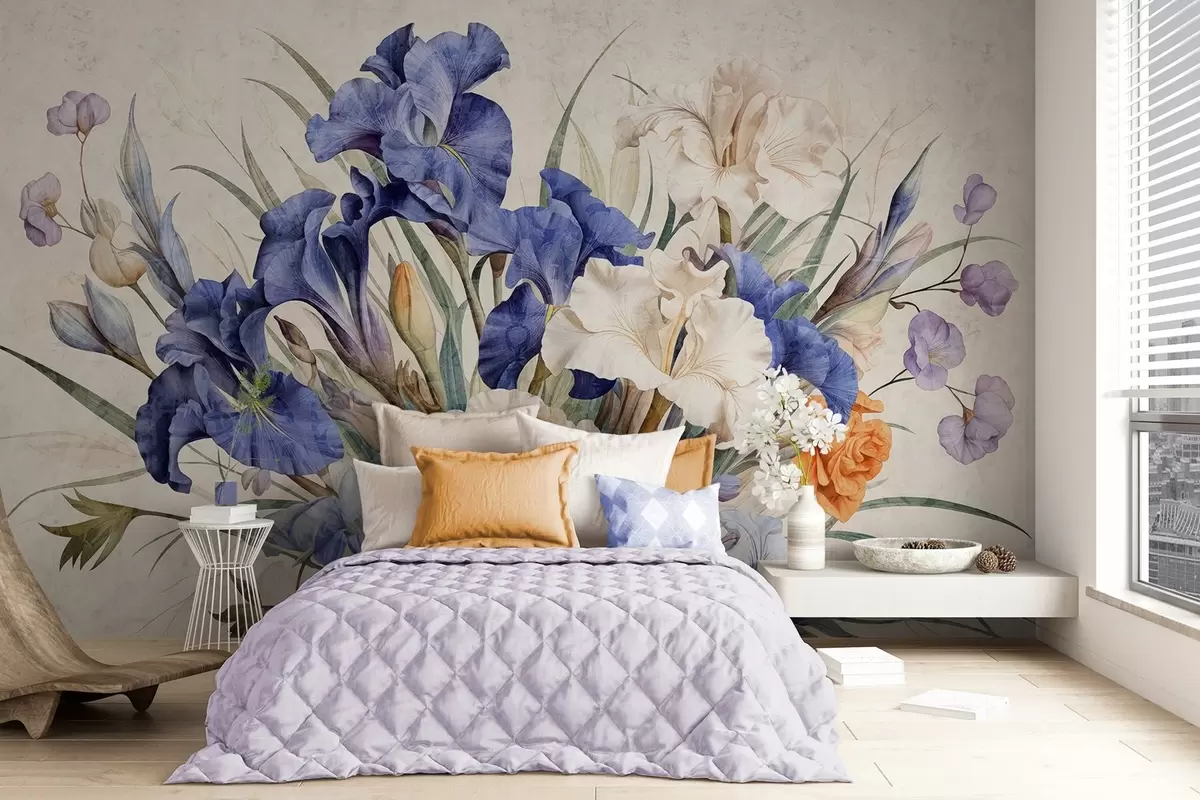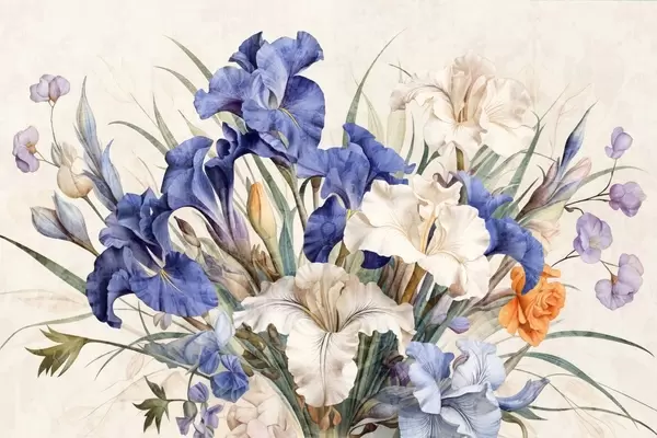 Wall murals Vintage textured bouquet of purple irises, arranged with green leaves and stems, set against a soft background Nr. w09263