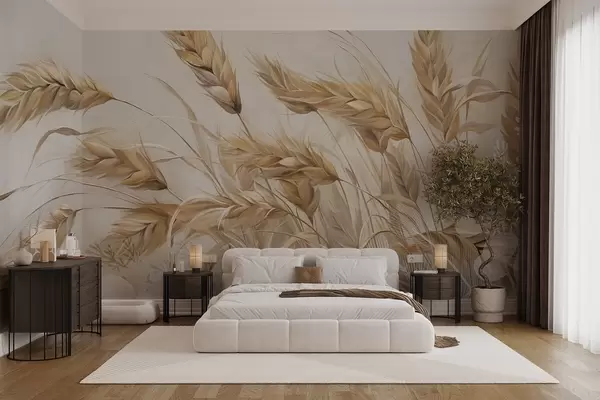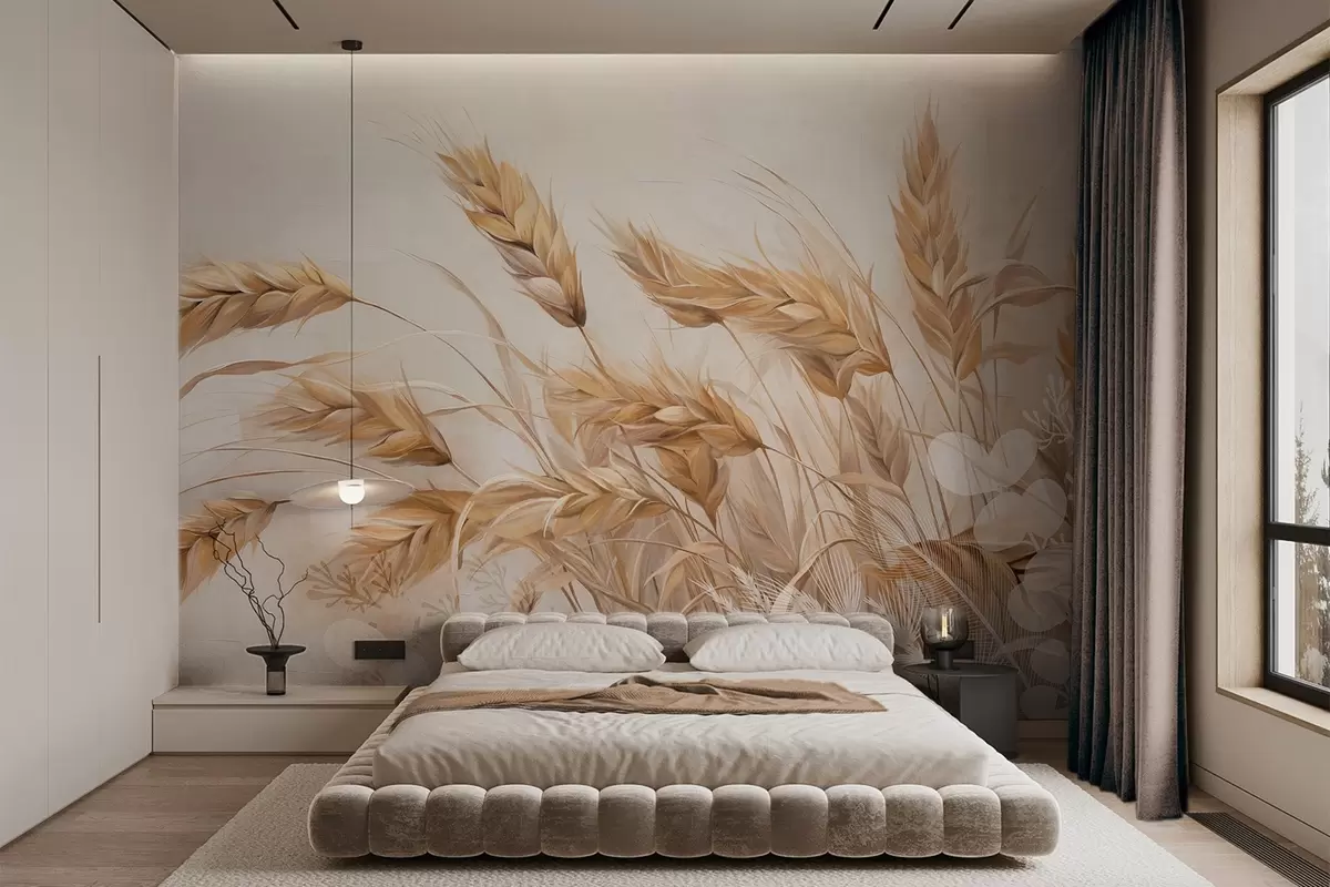 Wall murals Wheat textured field with beige ears of grain swaying in the wind, soft and muted colors, creating a sense of warmth Nr. w09264