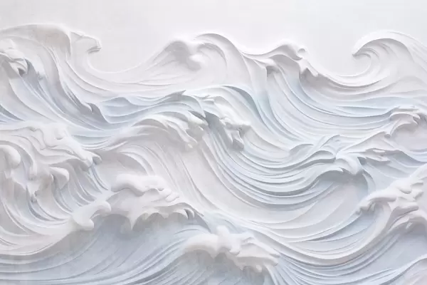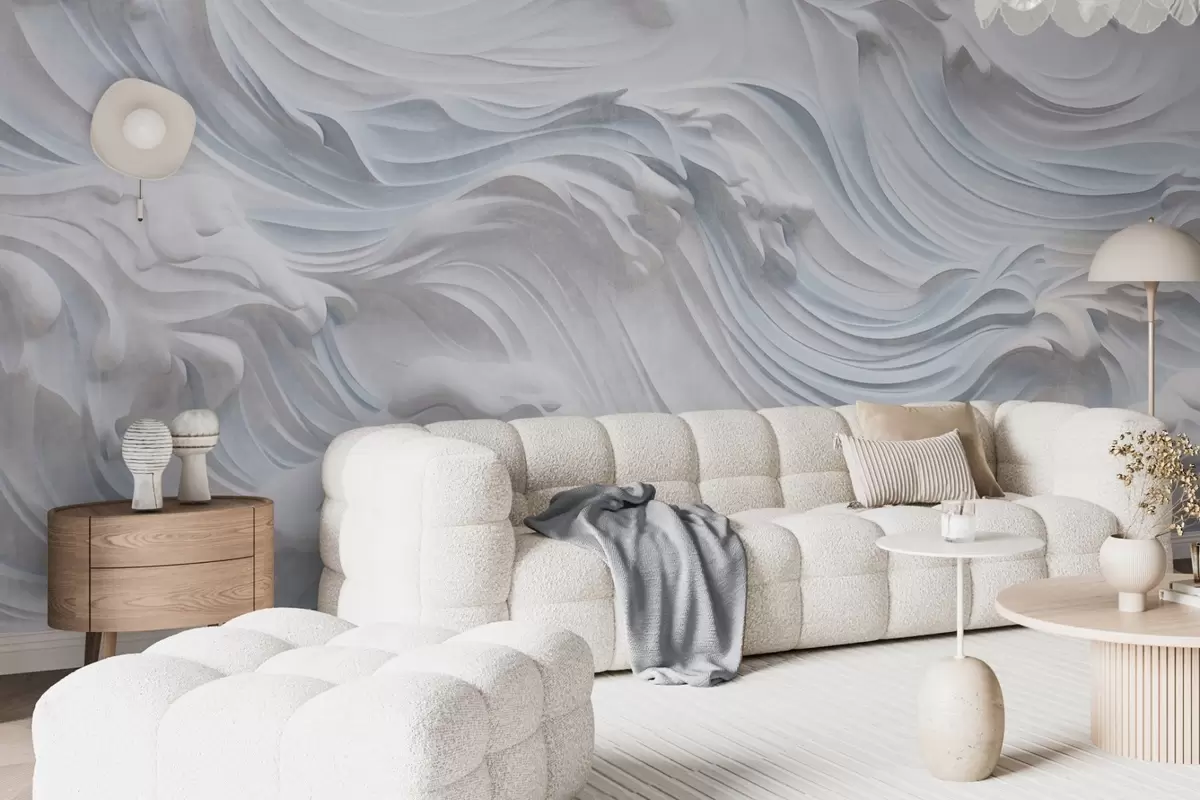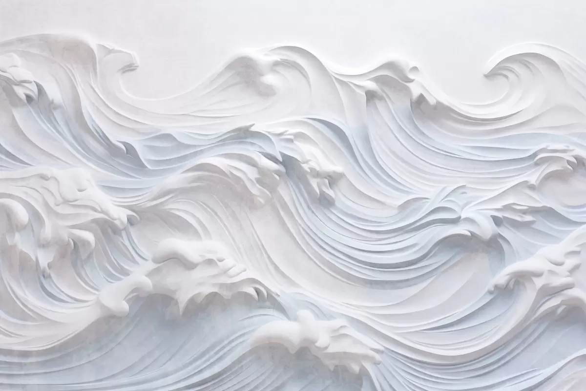 Wall murals White and light blue textured abstract ocean waves with foam, flowing from left to right, dynamic and textured print Nr. w09266