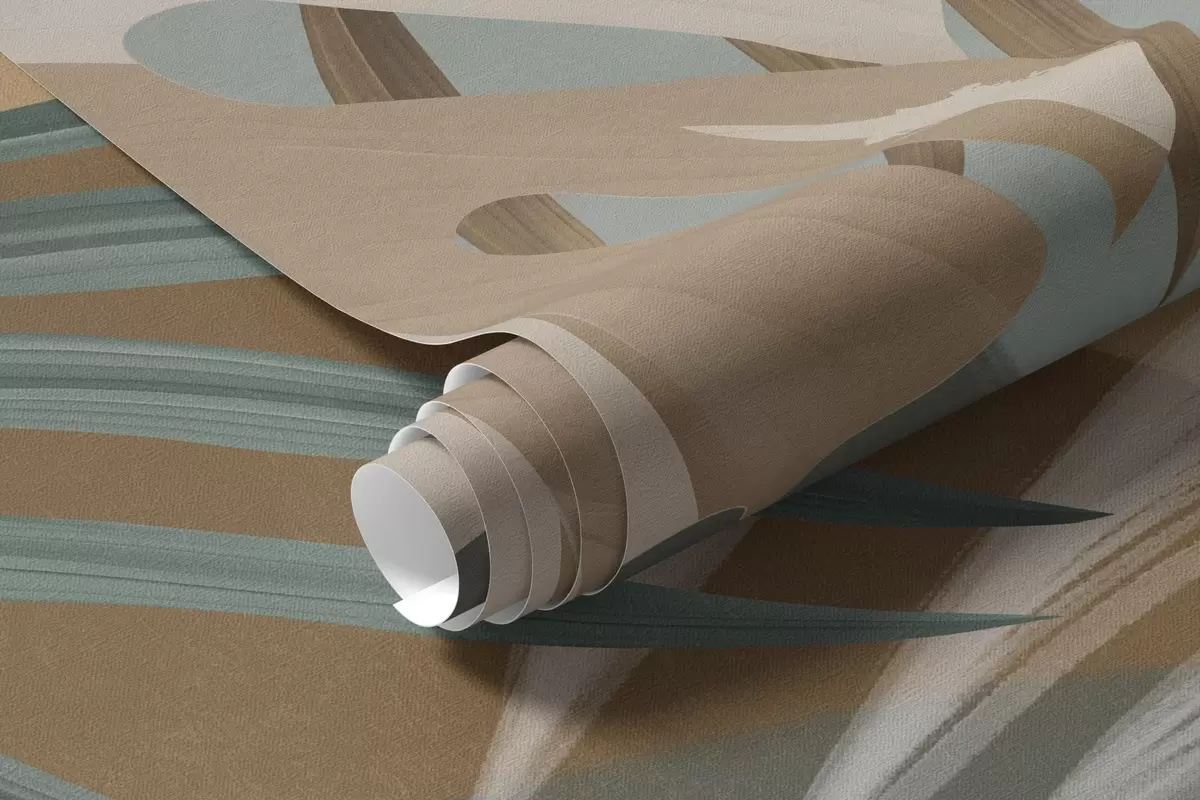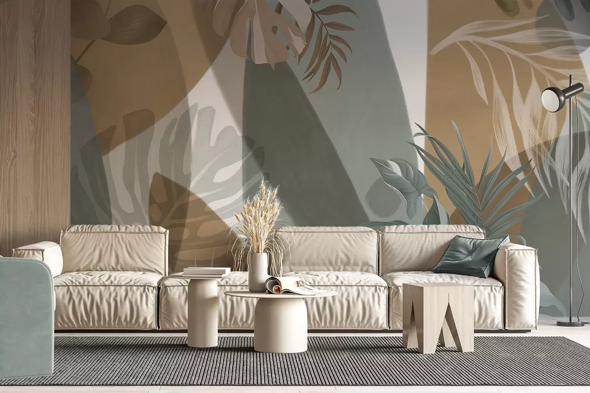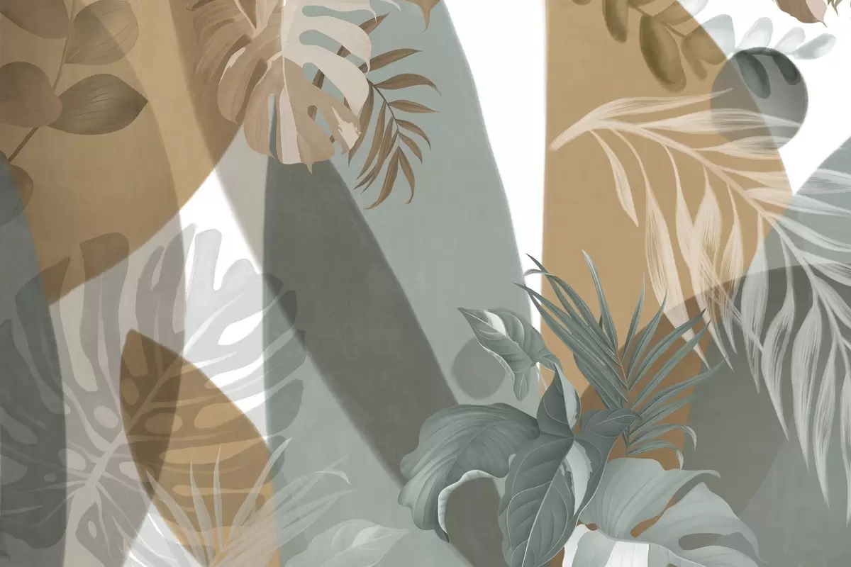 Wall murals Monstera leaves and palm leaves in a pattern with brown, white and green colors, tropical vibe, abstract shapes, decorative Nr. w09288