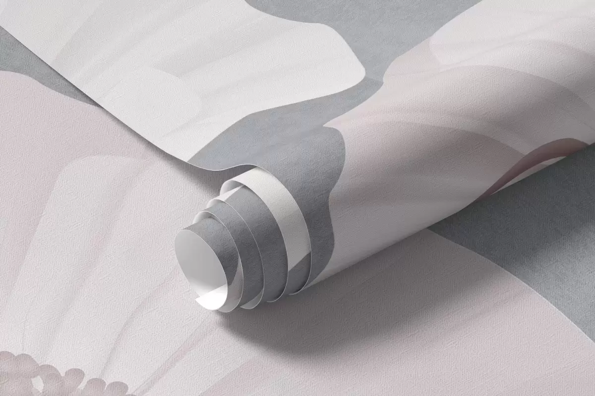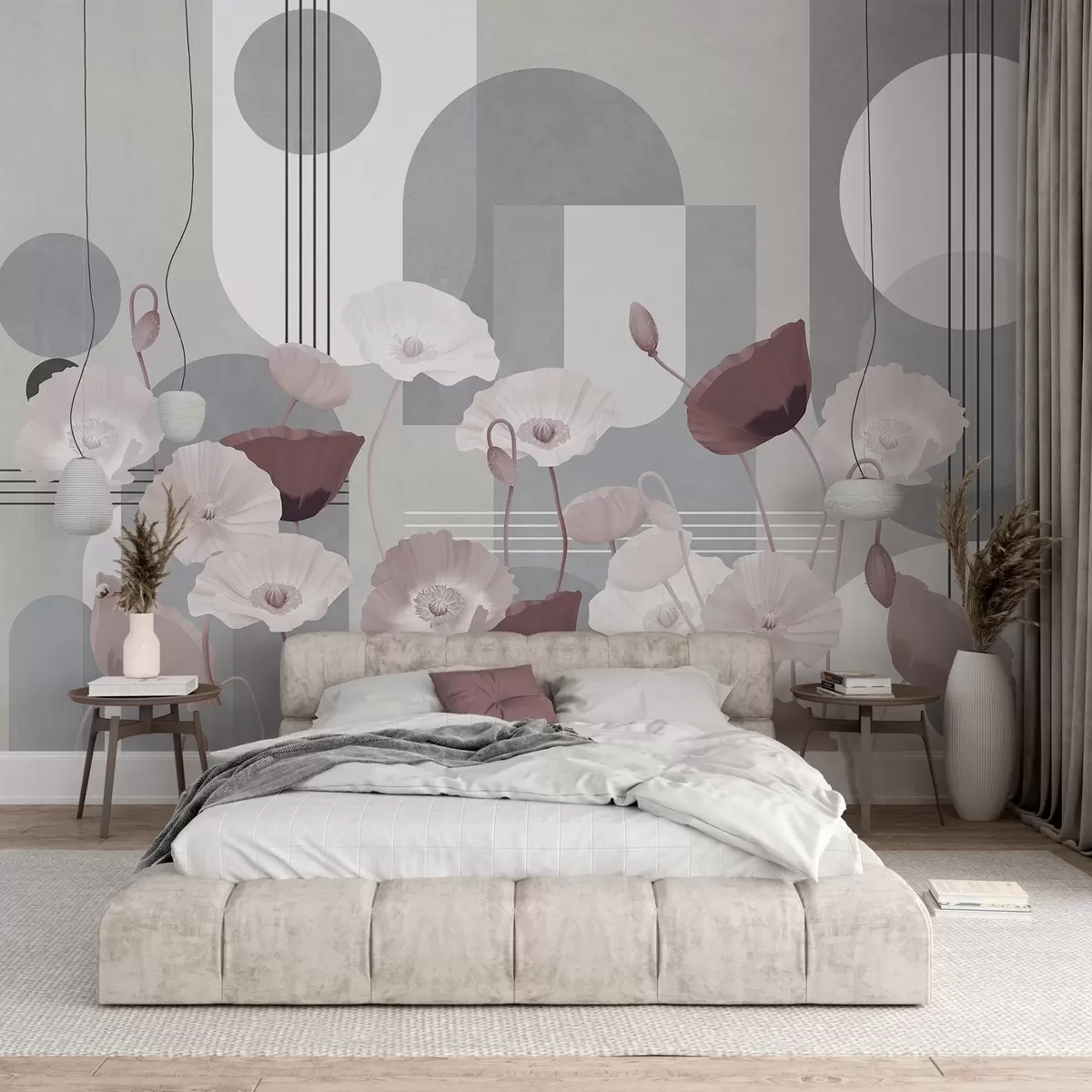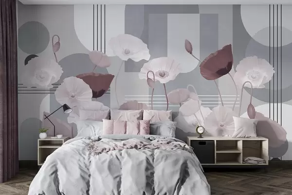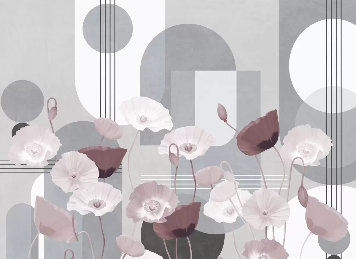 Wall murals Poppies in white and gray colors with geometric shapes in the background, circles and arches, minimalist style, soft colors Nr. w09289v1