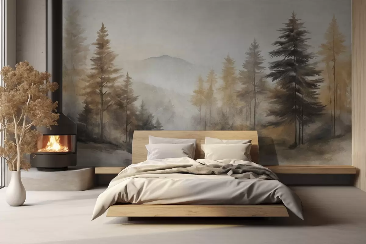 Wall murals Textured autumn forest with tall pine trees and mountains in the background, the colors are muted and earthy painting style Nr. w09290