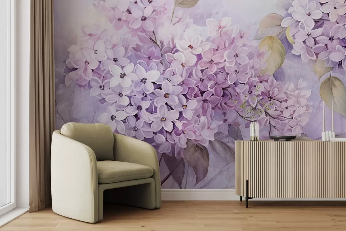 Wall murals Lilac textured flowers with light purple petals, light green leaves, watercolor style, soft, pastel colors, delicate brushstrokes Nr. w09291