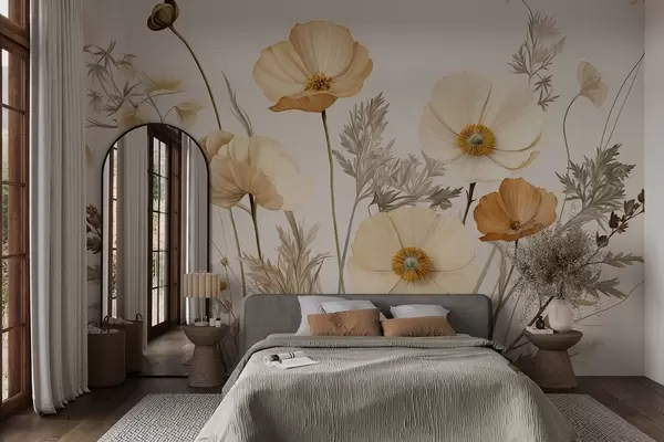 Wall murals Orange and white vintage textured poppies with thin stems and leaves, light beige background, watercolor style Nr. w09293