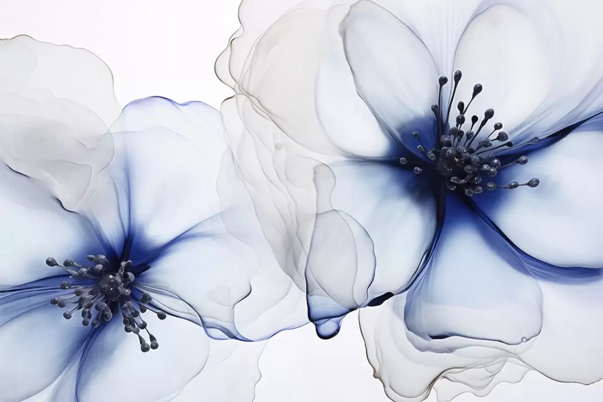 Wall murals Two translucent textured blue flowers with visible stamens, overlapping delicate petals, and a soft flowing texture Nr. w09295v1